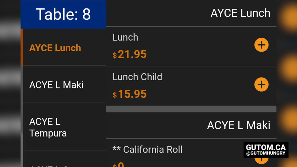 At the top RIGHT of the menu you’ll see the AYCE prices. Here you ADD+ how many people at your table. On the LEFT column you select the type of menu ie All You Can Eat AYCE Lunch, or A La Carte ACYE.