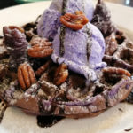 Ube Purple Yam Special House Waffle, Canadian Syrup, Powdered Sugar, Ube Jam, 2 SCOOPS OF UBE ICE CREAM, and Pecans.