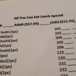 This menu includes Sashimi, Nigiri sushi, and cones! Karaage, prawn tempura, and more! Tea, soy sauce and wasabi are included.